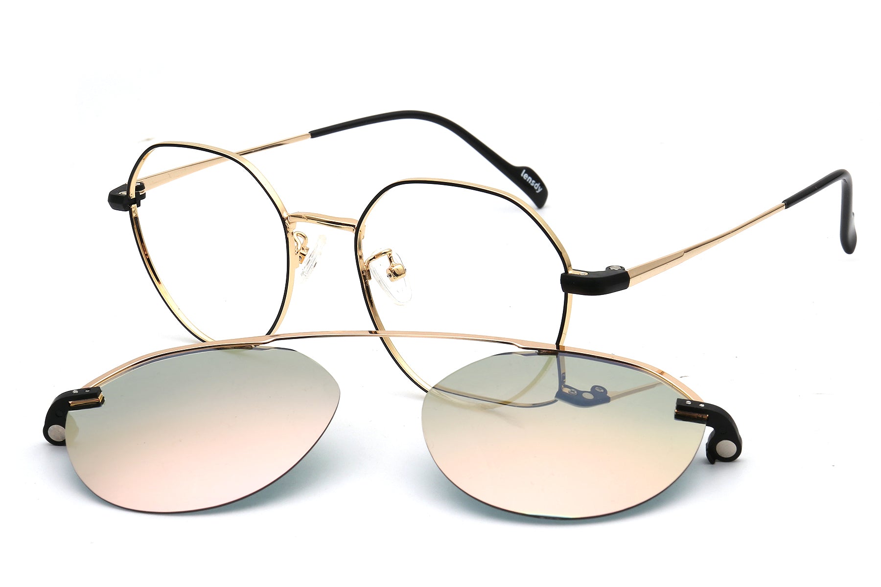 Delicate yet daring, BlushGlow features a black and gold panto-shaped metal frame with a soft pink magnetic sun lens. These metal frame magnetic glasses blend elegance and function, offering smooth transitions between indoor elegance and sunlit outings.