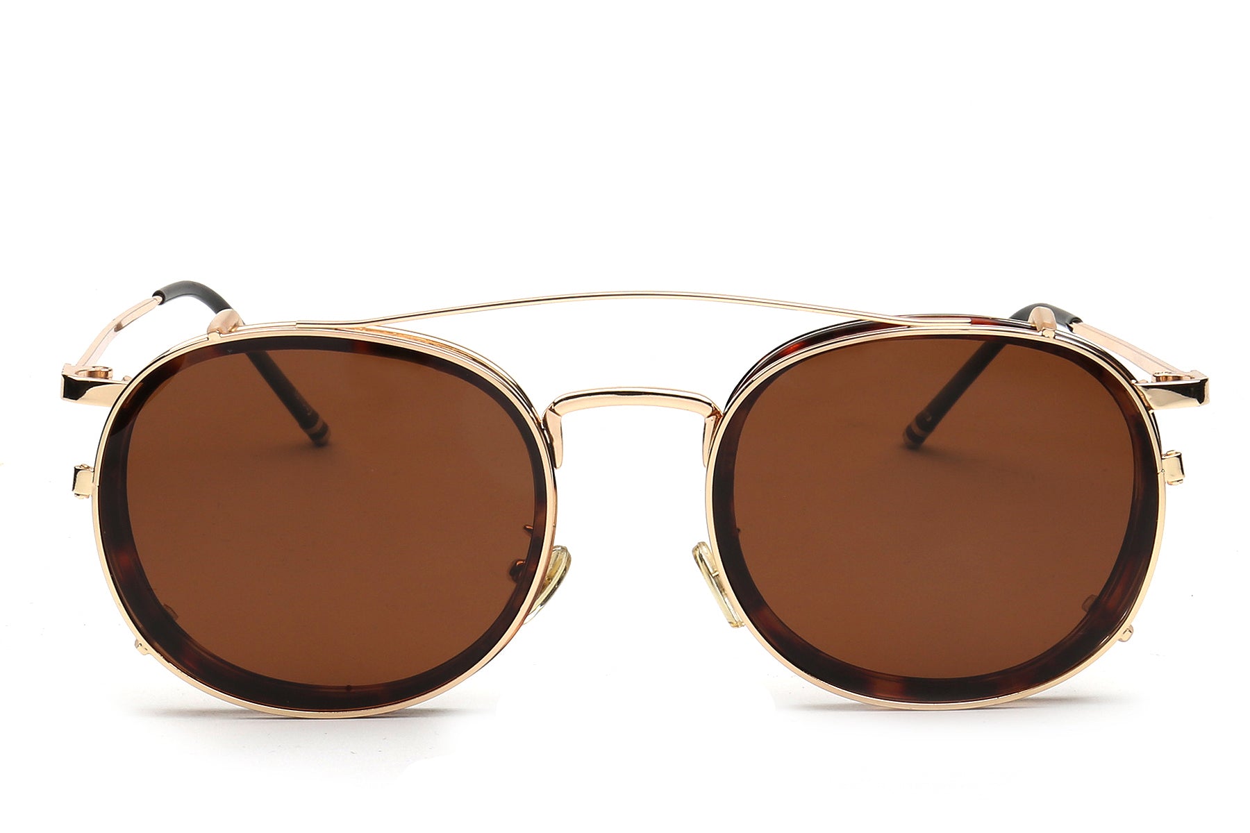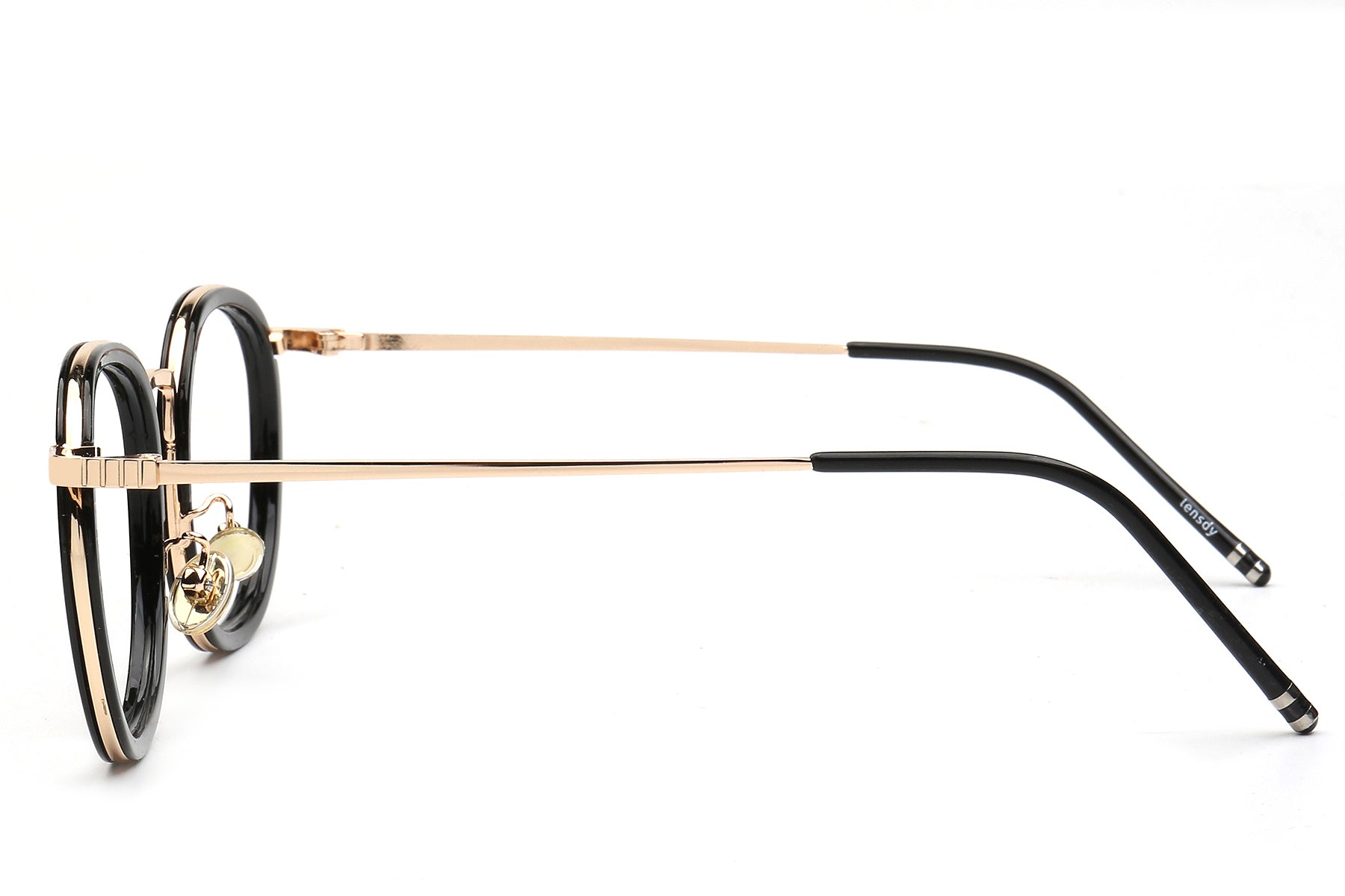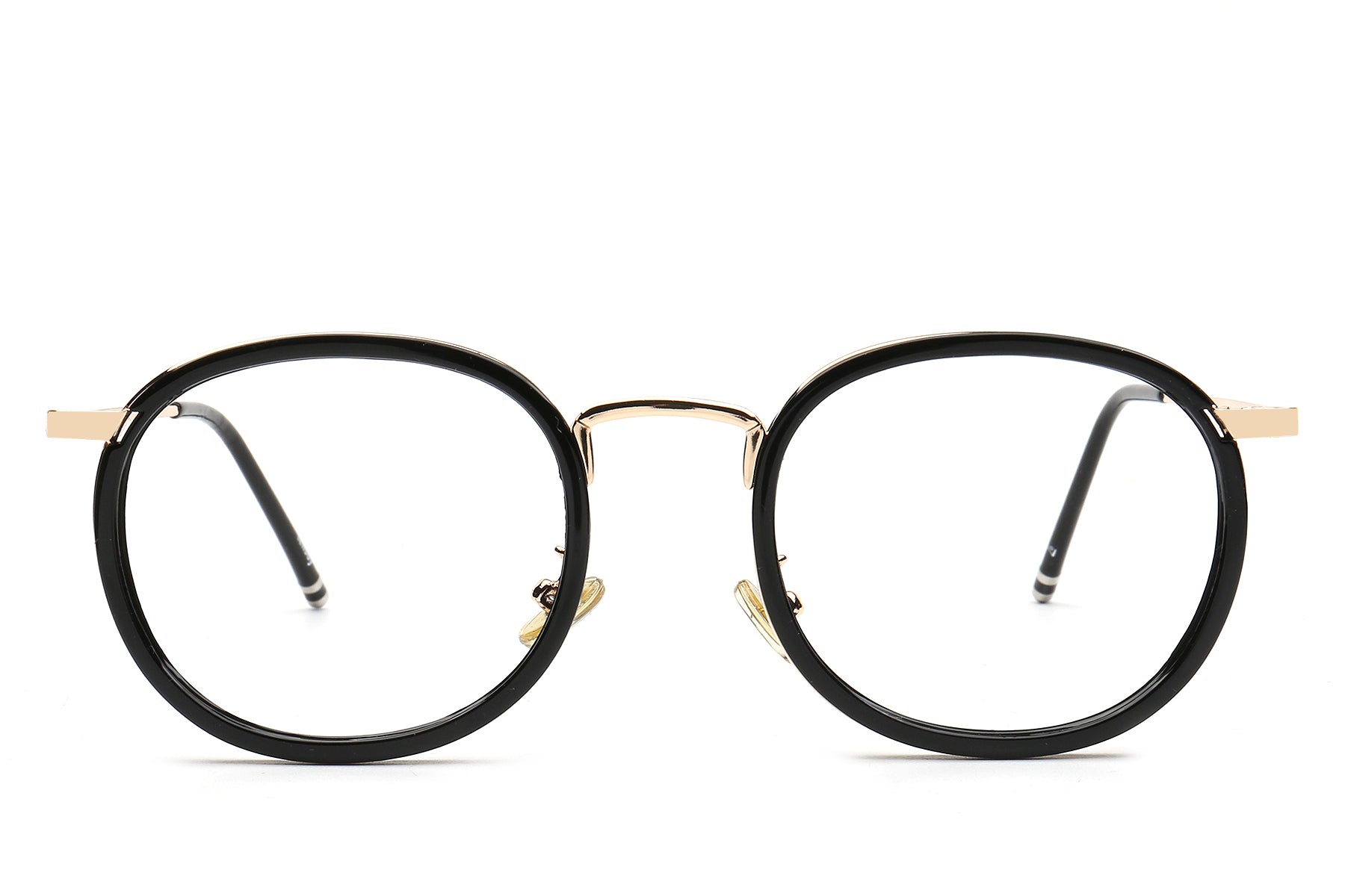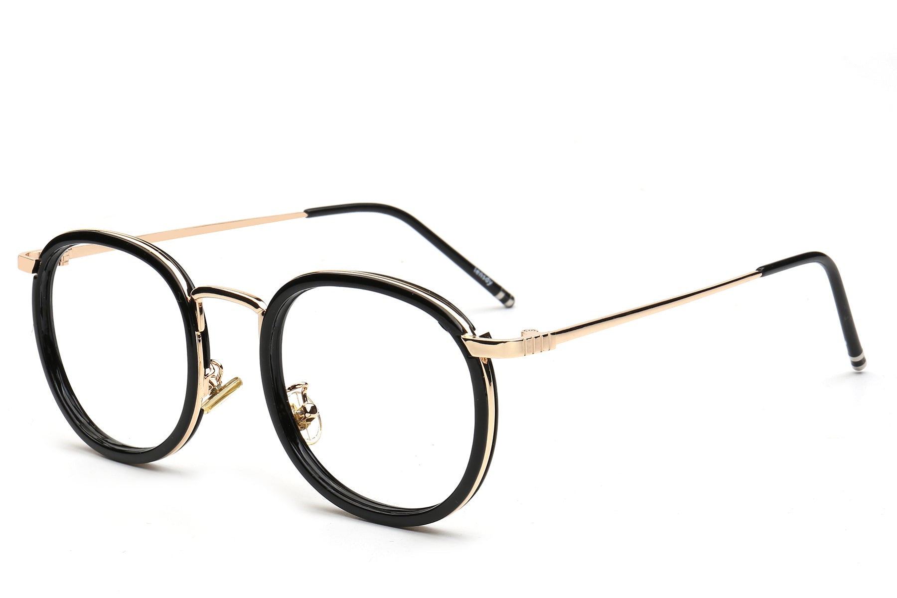 Vintage round-frame optical glasses infuse elegance and classic charm into daily life. The rounded frame shape naturally exudes an artistic touch. The black and gold patchwork design balances the retro feel with a light luxury style. They are not only practical tools for correcting vision but also fashionable accessories that enhance the overall look of your outfit. The striking icy blue lens is a collision of classic and modern elements, catching people's attention.